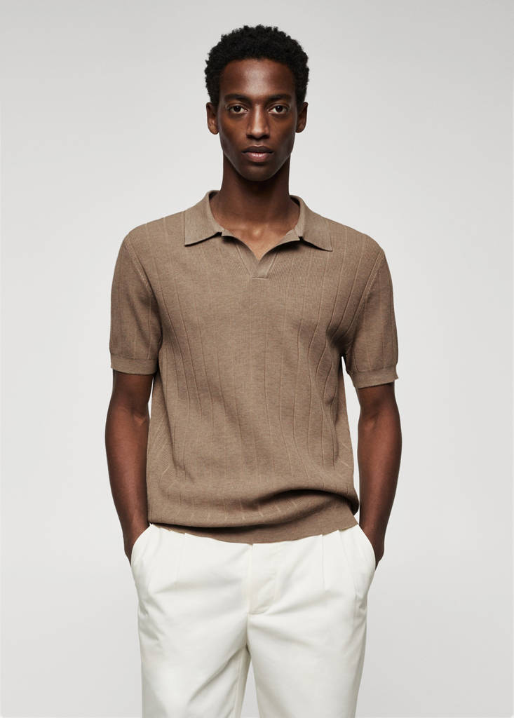 Fermeture au niveau du col. Tissu en maille fine. Tissu en modal mélangé. Col polo. Manches courtes. Le mannequin mesure 187 cm et porte une taille M