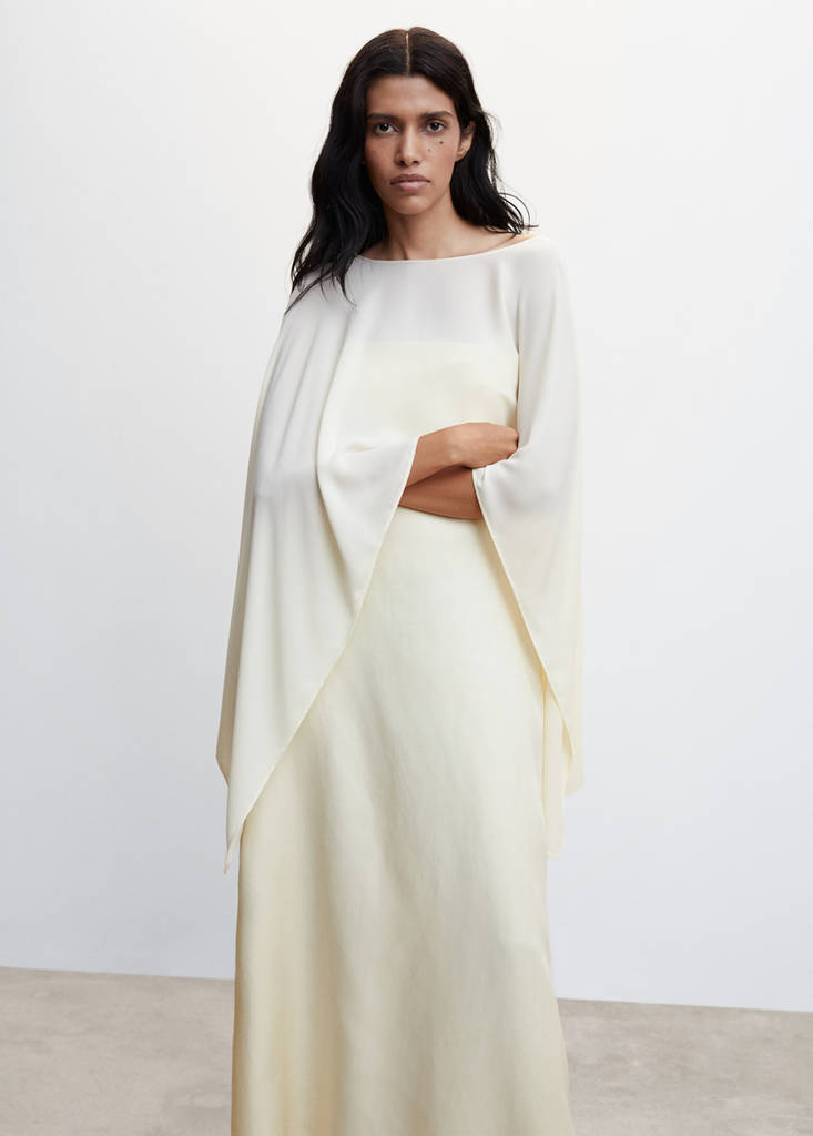 Tejido fluido. Diseño capa. Diseño corto. Cuello barco. Mangas acampanadas. Colección fiesta y ceremonia