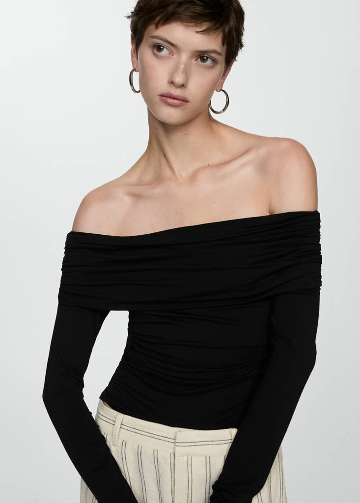 Camiseta hombros descubiertosPrecio actual [Ch$ 29.990,00 ]Ch$ 29.990,00Selecciona un colorNegroLa modelo lleva la talla S y mide 176cm.Selecciona tu tallaSMLMedidasAñadir a FavoritosVer lookEnvío gratis a tiendaTejido fluido. Diseño recto. Cuello vuelto. Hombros descubiertos. Manga larga. Detalles fruncidosDetalles, composición y cuidadosDisponibilidad en tienda