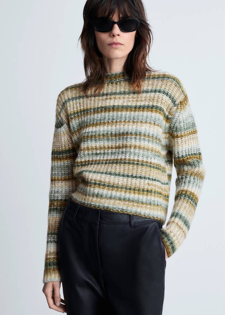 Tejido de punto grueso. Estampado de rayas. Diseño recto. Cuello redondo