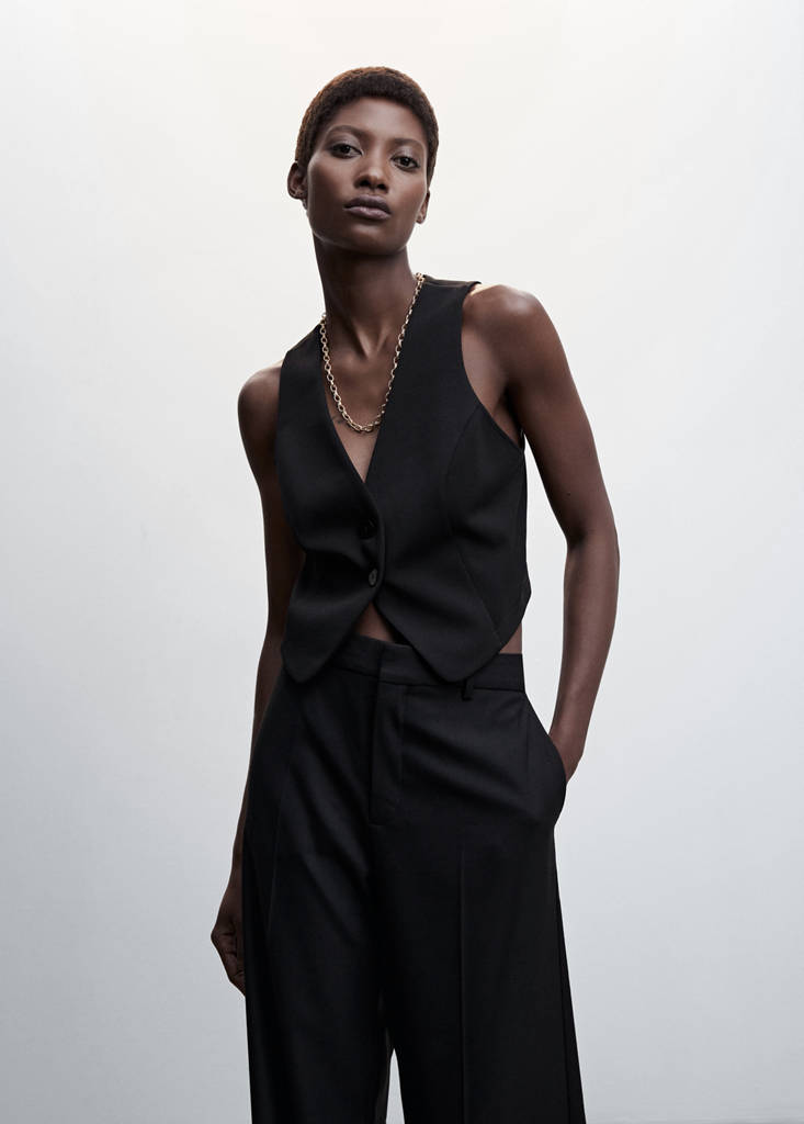 Tejido fluido. Diseño recto. Diseño crop. Cuello pico. Sin mangas. Cierre de botones. Total look. Festival Season