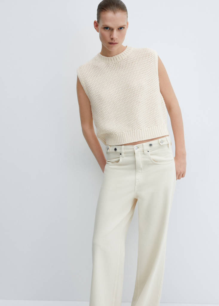 Tejido mezcla de lana. Tejido de punto grueso. Diseño recto. Cuello redondo. Sin mangas. Sin cierre. Terminaciones en canalé