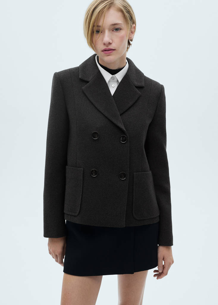 Diseño corto. Diseño recto. Manga larga con abertura. Dos bolsillos de parche en la parte delantera. Cierre de doble botonadura. Forro interior. Tejido mezcla de lana. Cuello pico con solapa