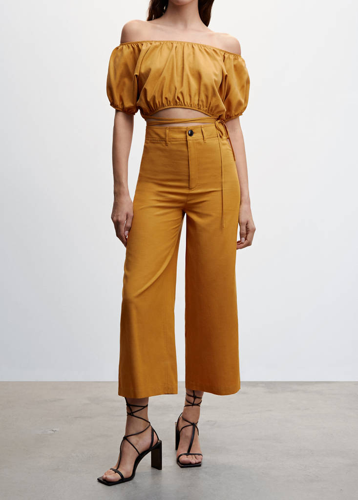 Tejido mezcla de algodón. Diseño crop. Diseño wideleg. Tiro alto. Cierre de cremallera y botón. Trabillas. Dos bolsillos de parche en la parte posterior. Total look