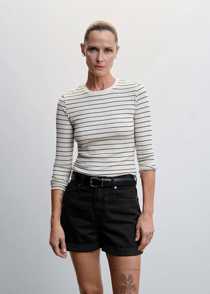 Tejido de algodón estilo tejano vaquero. Diseño corto. Tiro alto. Trabillas. Bolsillos laterales. Bolsillos de parche en la parte posterior. Bajo con vuelta. Cierre de cremallera y botón