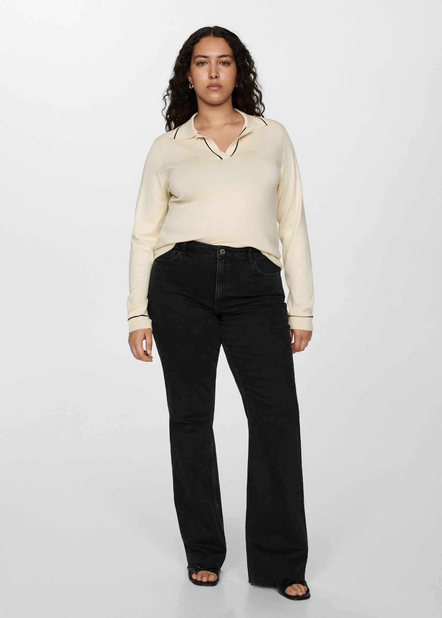 Tejido de algodón estilo tejano vaquero. Diseño campana. Estilo flare. Tiro medio. Trabillas. Cinco bolsillos. Cierre de cremallera y botón. Bajo deshilachado. Full length. Disponible Plus. Largo interior 83 cm. La modelo mide 1,79 y lleva una talla S/36.