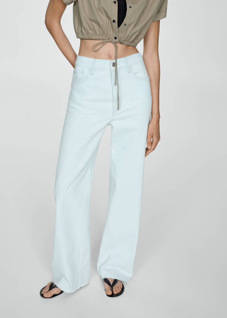 Tejido de algodón estilo tejano vaquero. Diseño largo. Diseño wideleg. Tiro alto. Trabillas. Dos bolsillos delanteros. Bolsillo portamonedas. Dos bolsillos de parche en la parte posterior. Cierre de cremallera y botón. Bajo deshilachado. Largo interior 83 cm