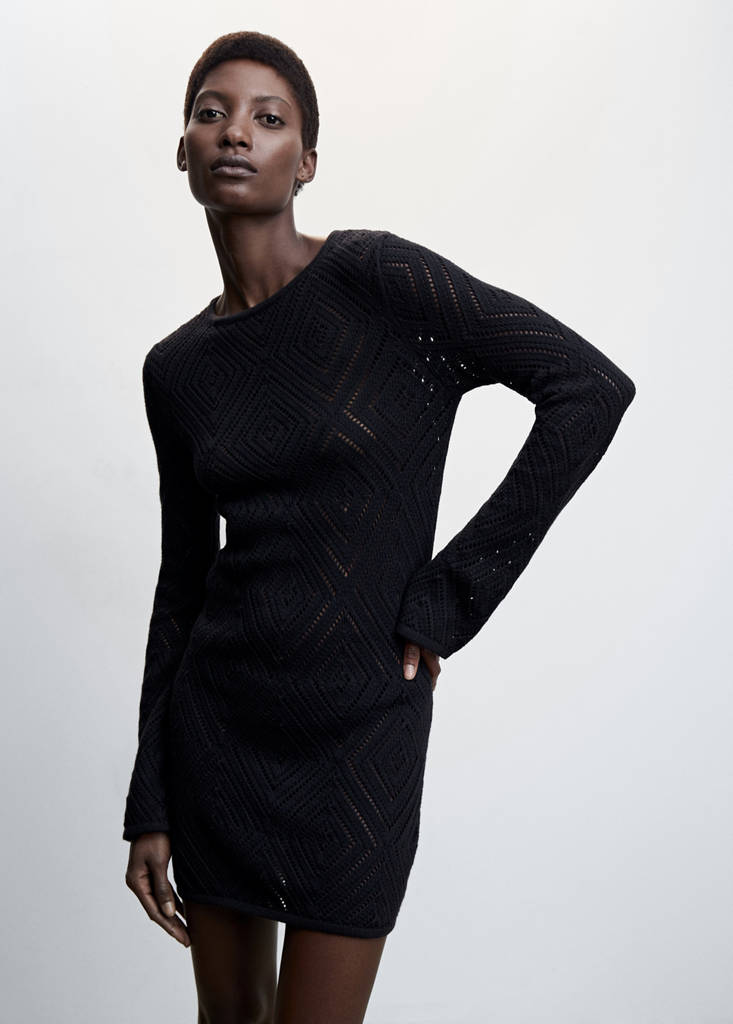 Tejido mezcla de algodón. Tejido calado. Punto medio. Diseño recto. Diseño corto. Diseño geométrico. Cuello redondo con cierre de botón. Abertura en la espalda. Manga larga acampanada. Festival Season