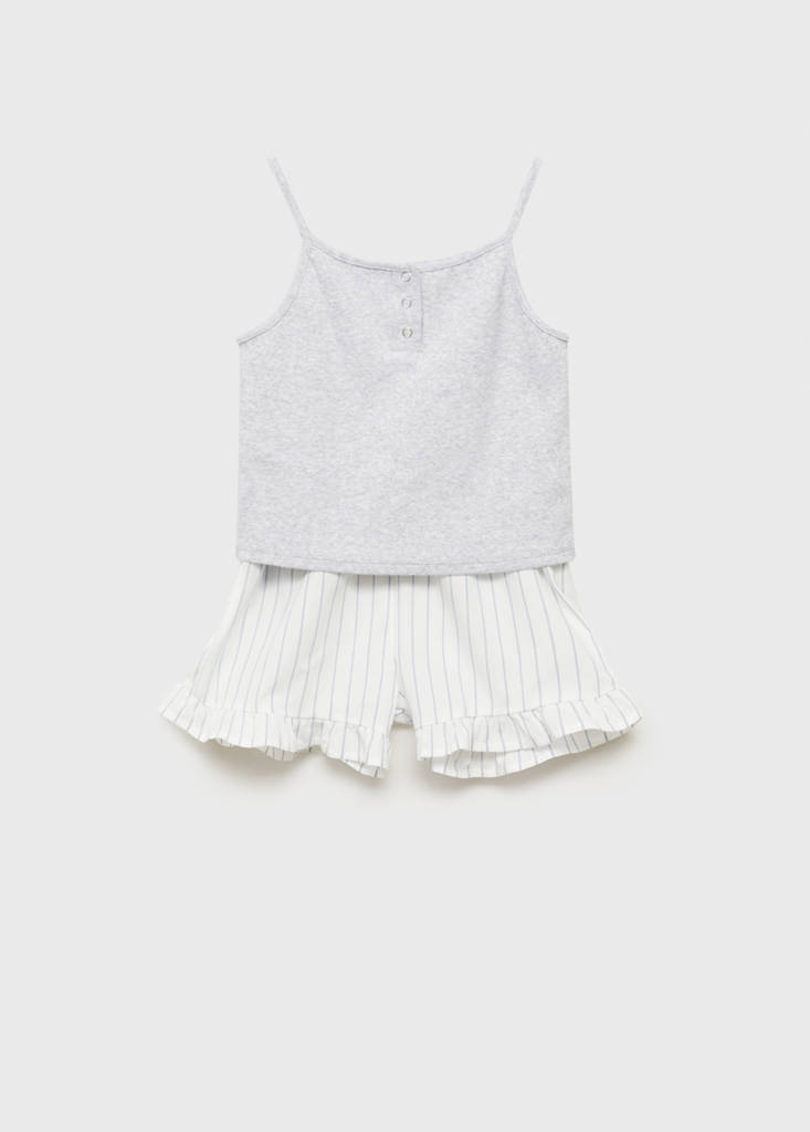 100% Cotton. Short design. Combined design. Thin straps. Round neck. Ruffle hem. Three buttons fastening