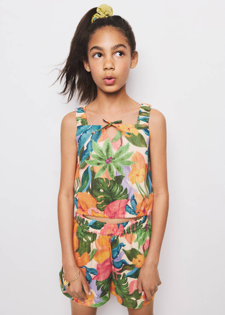 100% cotton fabric. Straight design. Tropical print design. Ruched straps. Elasticated ruched hem. Back opening with bow fastening. Total look