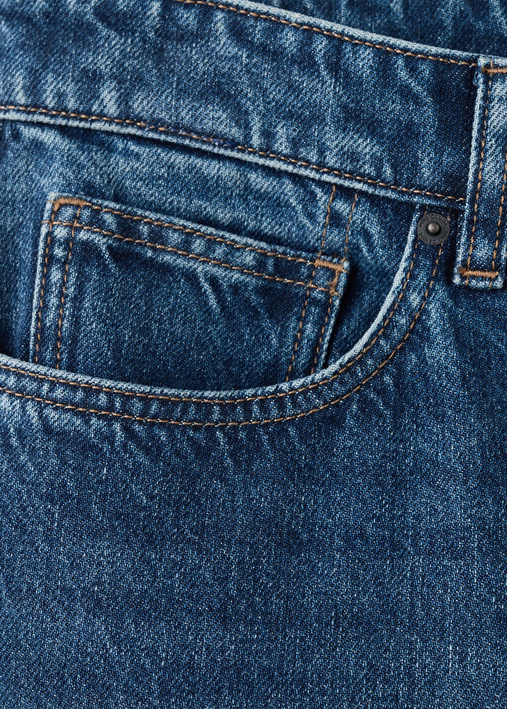 Silhouette Carrot. Tapered fit: wide cut at the top that narrows from the knee to the ankle. Low cropped. 100% cotton denim-style fabric. Button and zip fastening. Belt loops. Two-coin pockets. Two patch pockets at the back.