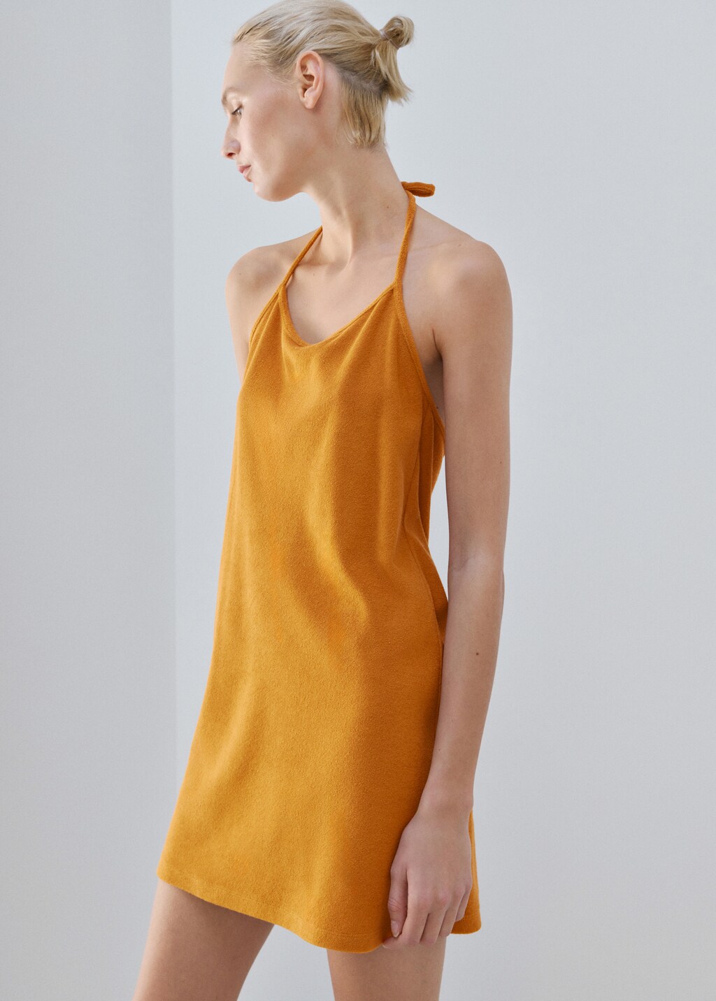 Cotton fabric. Tie fastening. Round neck. Short design. Seamless. Provides comfort and freedom of movement. Available in three colours. Coordinates with more products from the collection.