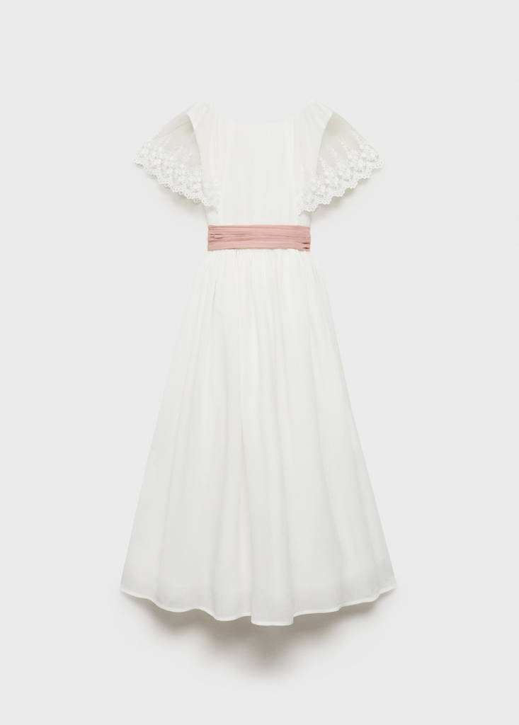 Bamboo-effect fabric. Organza fabric on the sleeves. Round neck. Short sleeves with stitched details. Embroidered details. Ribbon on the waist with tie closure. Rounded neck at the back. Button fastening on the back section. 100% cotton lining. The dress length is 100 cm. Party, ceremony and communion collection