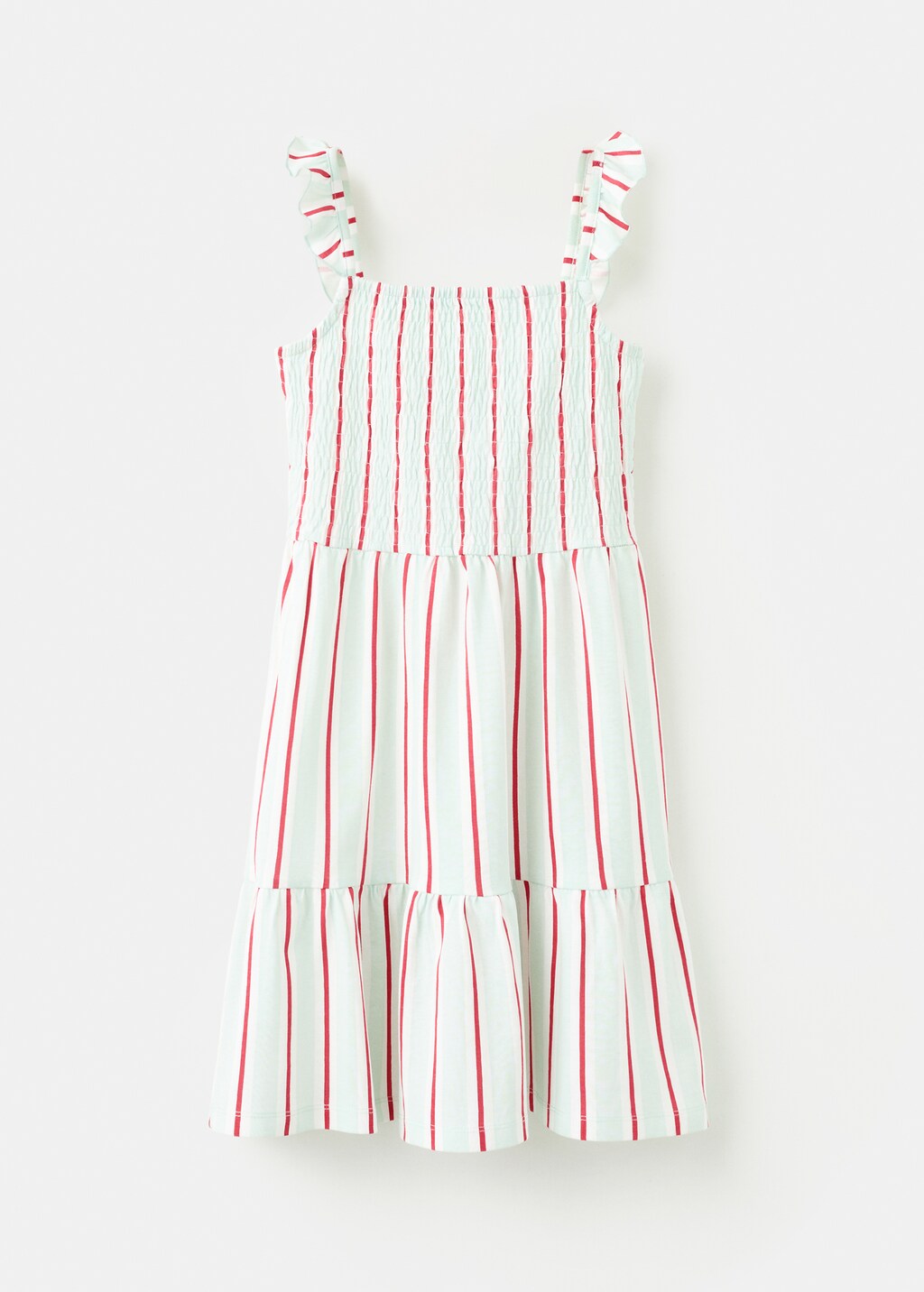 Cotton fabric. Stripe design. Ruched detail at the front. Honeycomb pattern. Ruffled straps. Frill on the bottom.