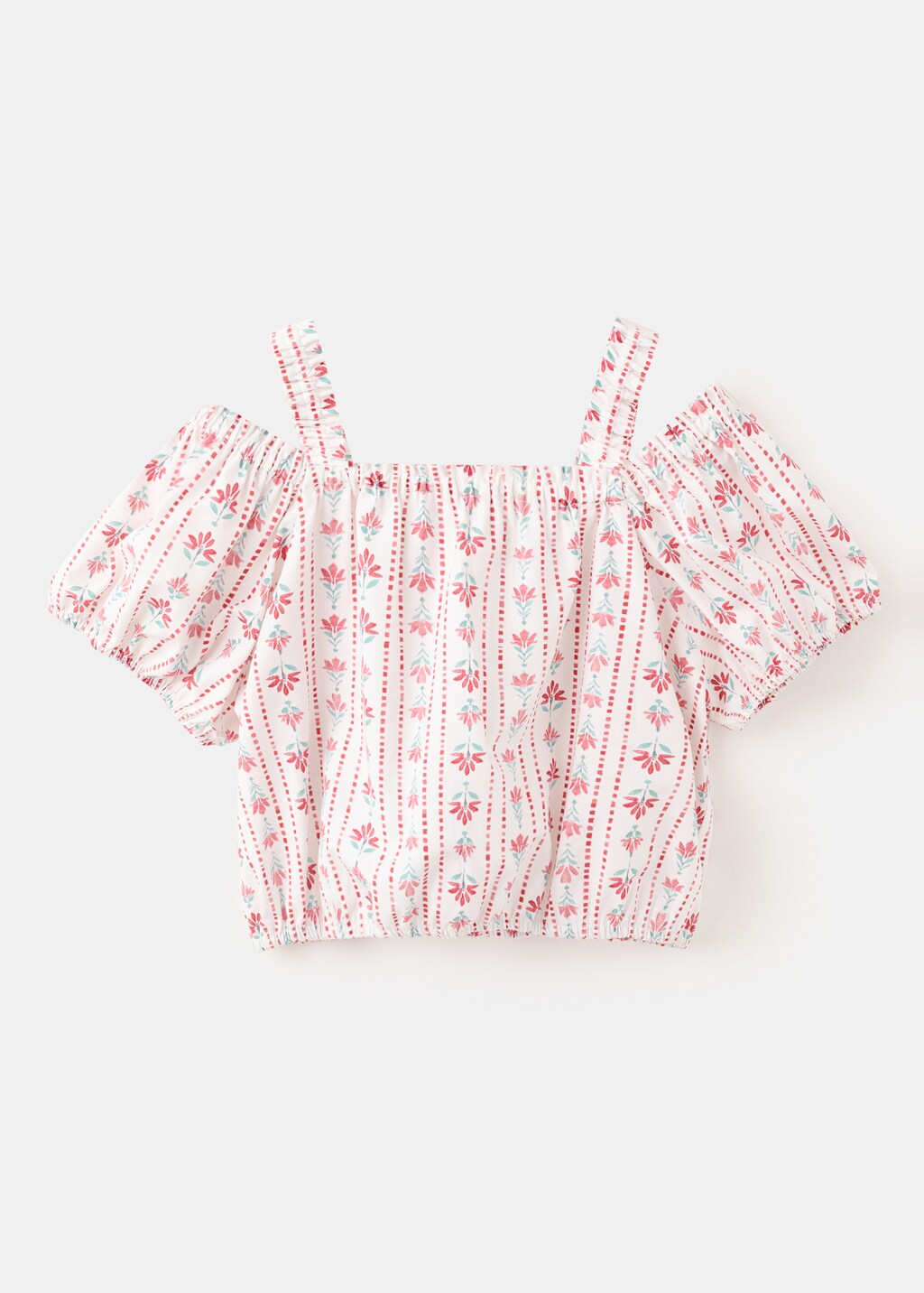 100% Cotton. Floral print. Crop design. Short sleeves. Gathered details.