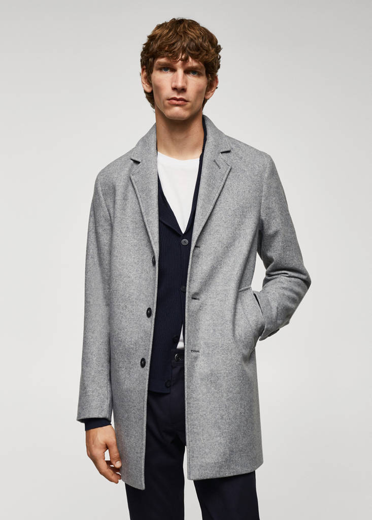 Recycled wool mix fabric. Slim fit. Designed for the cooler months. Straight design. Medium length. Notch lapels and buttonhole. Two side pockets. Side opening at the hem. Inner lining. Interior pocket. Long buttoned sleeves. Front closure with buttons