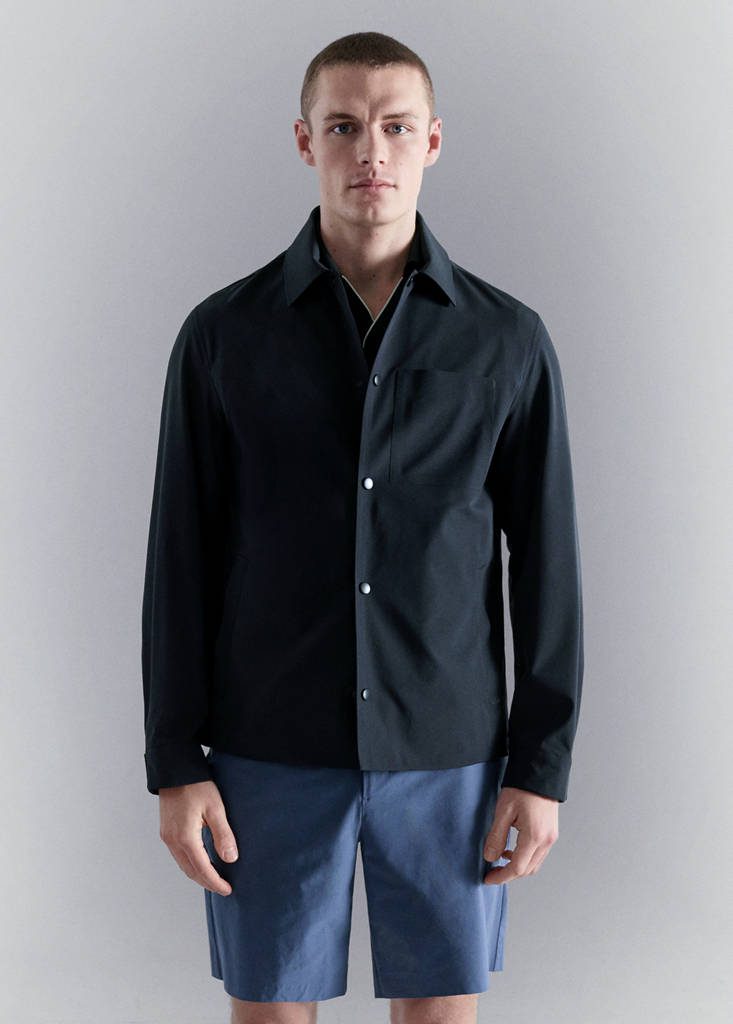 Performance Collection. Thermoregulating: This fabric offers optimal breathability to keep you at a stable temperature. Comfort Stretch: Stretch fabric for added comfort. Water-repellent: The durable finish of this garment protects against light rain, repelling contact with water and raindrops. Shirt collar. Concealed snap button fastening. Patch and flap chest pocket. Two front welt pockets and water-repellent zip closure. Long sleeves with adjustable loops. Without inner lining. Inner pockets. Inner seams with thermo-sealed reinforcement