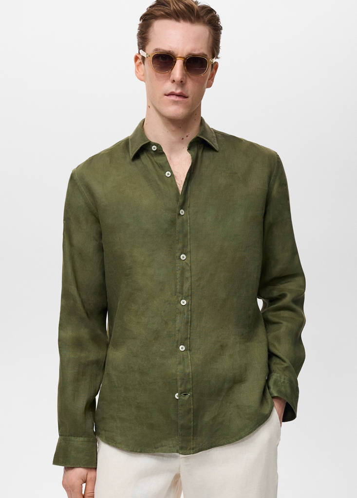 The light blue colour is an online exclusive. The porcelain blue model is an online exclusive. Regular fit. 100% linen fabric. Shirt collar. Front closure with buttons. Long sleeves with buttoned cuffs. Detail of rear calipers. Rounded base
