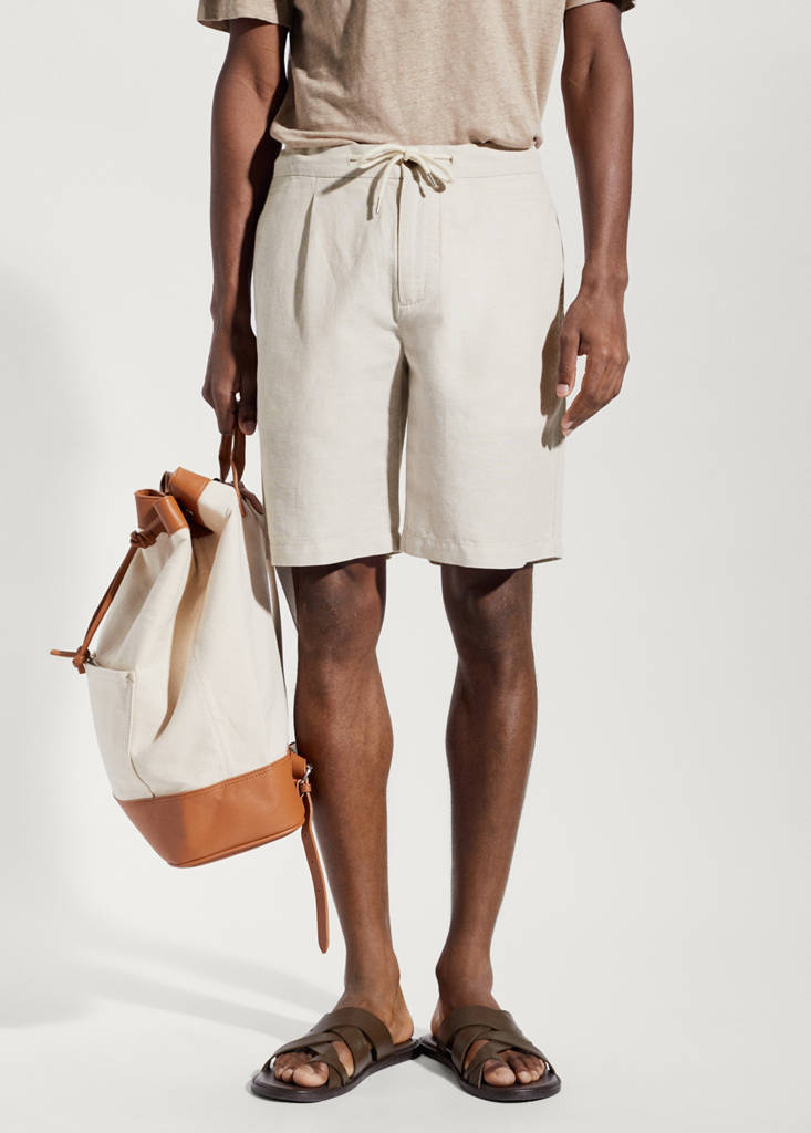 Slim fit. Linen and cotton mix. Concealed zip and button fastening. Elastic waist with drawstring. Darts on the front. Two side welt pockets. Basics Collection