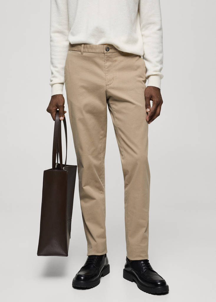 Slim fit. Chinos style. Five pockets. Cotton elastic. Belt loops. Zip and button fastening. Two side pockets. Coin pocket. Two welt pockets at the back