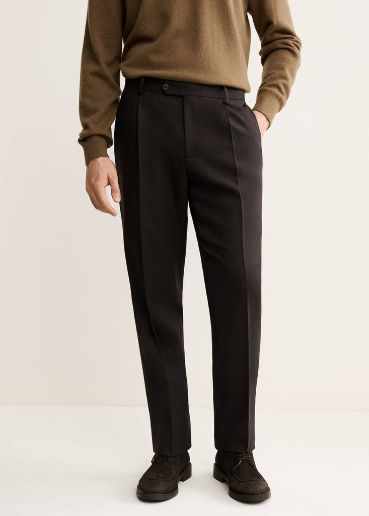 100% wool fabric. Regular fit. Darts on the front. Pressed crease detail at the front and back. Button, hook and zip front closure. Buttons on the inside of the waistband for shoulder straps. Belt loops. Two side welt pockets. Two welt pockets with button at the back.
