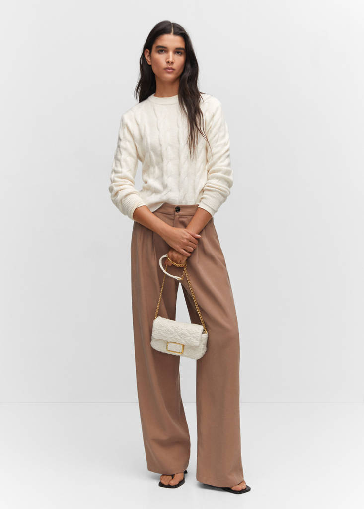 Small size. Cotton fabric. Textured fabric. Flap closure with magnetic button. Long detachable chain strap. Metallic detail. Inner lining. Party, ceremony and communion collection