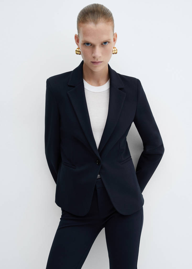 Punta di Roma knit fabric. Straight design. Lapel-collar V-neck collar. Lapel with notch. Long sleeves. Structured shoulders. Dart detail. Back slit. Inner lining. Total look. Blazer style. Office looks. Fitted design. Two front welt pockets