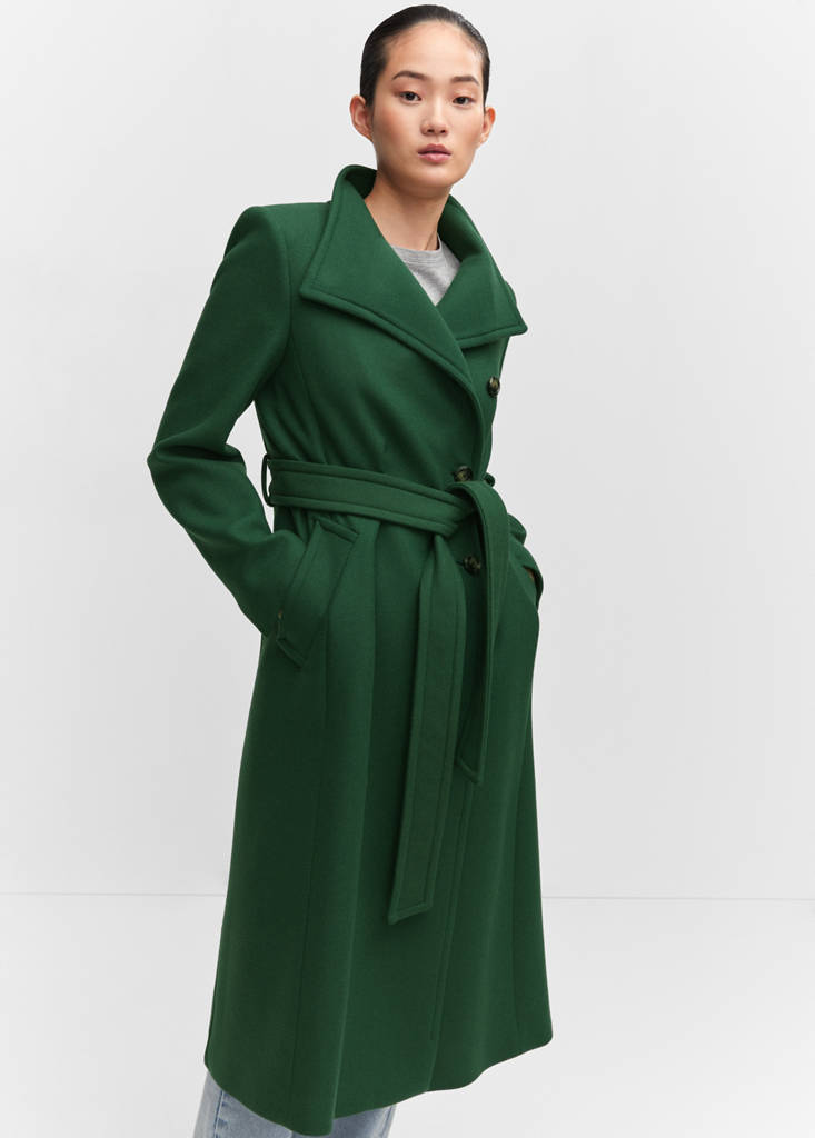 Italian Manteco wool fabric. Wool mix fabric. Heavy structure. Long design. Straight design. Notched lapel collar. Funnel neck. Long sleeves with slit. Button fastening at the front. Adjustable tie closure. Belt loops. Two side pockets. Back slit. Inner lining. Available Plus. Office looks