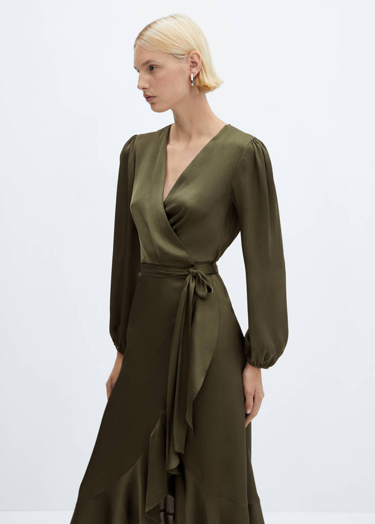 Fluid fabric. Satin finish. Midi design. Wrap design. A-line design. V-neck. Long sleeves with elastic cuffs. Ribbon on the waist with tie closure. Ruffle hem. Available Plus. Office looks