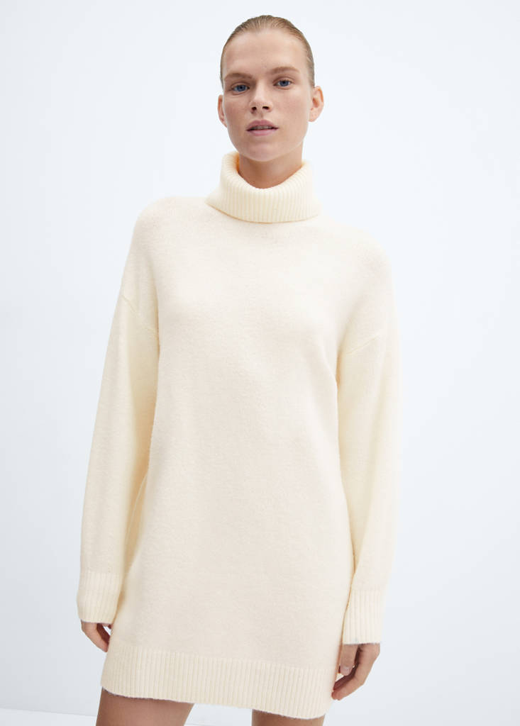 Wool mix fabric. Chunky knit fabric. Straight design. Short design. High neck. Long sleeves. No Fastening. The grey model is an online exclusive
