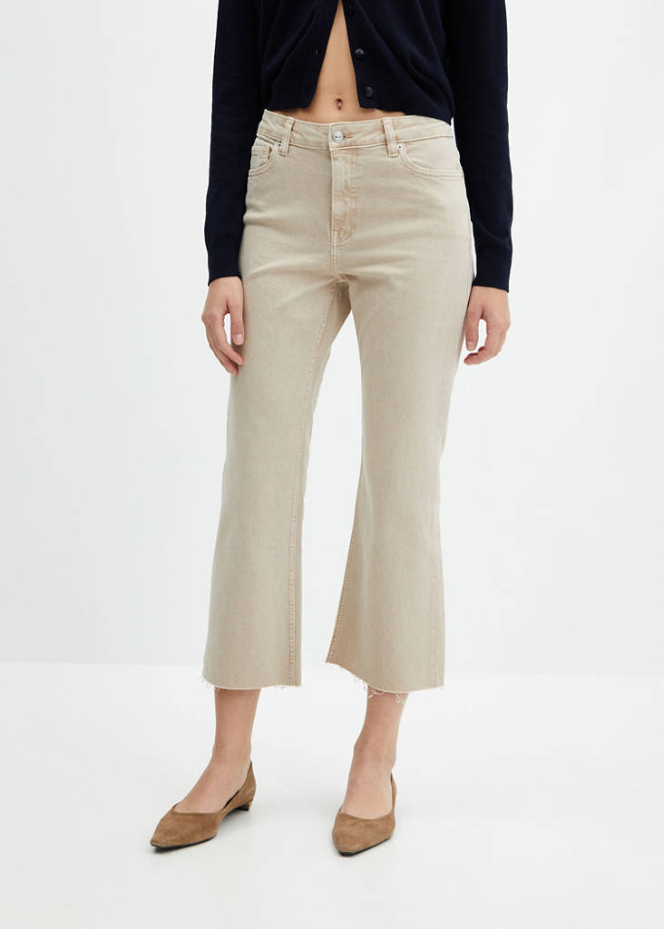 Denim-style cotton fabric. Recycled cotton-blend fabric. Stretch fabric. Flared design. Flare design. Crop design. Frayed hem. High waist. Belt loops. Five pockets. Zip and button fastening. Available Plus. Inseam 68 cm. Colour may vary according to model