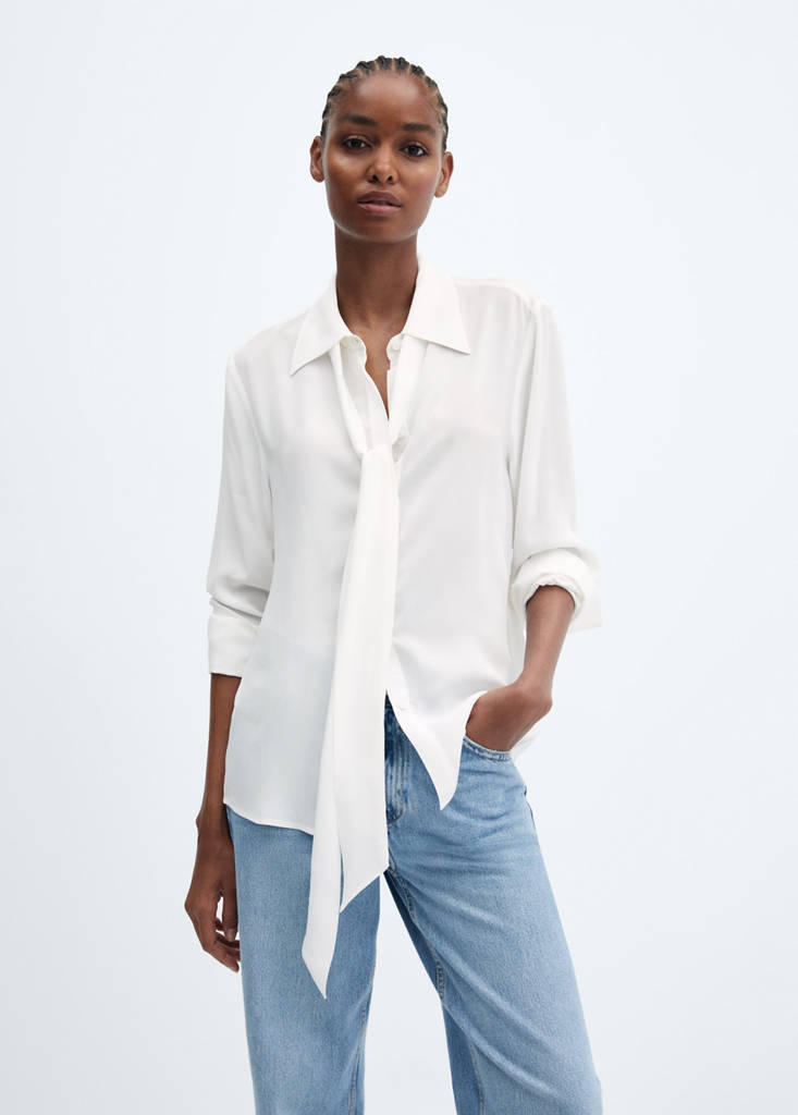 Tie-neck blouseCurrent price [¥359.00 ]¥359.00Select a colourWhiteSelect your size155/78A (XS)155/80A (S)160/84A (M)165/88A (L)170/92A (XL)175/96A (XXL)175/100A (3XL)DimensionsAdd to WishlistSee lookFree delivery to storeFluid fabric. Straight design. Shirt collar. Long sleeves with buttoned cuffs. Bow fastening on the neck. Removable bow on the neck. Office looks. Front closure with buttonsDetails, composition and careStore availability