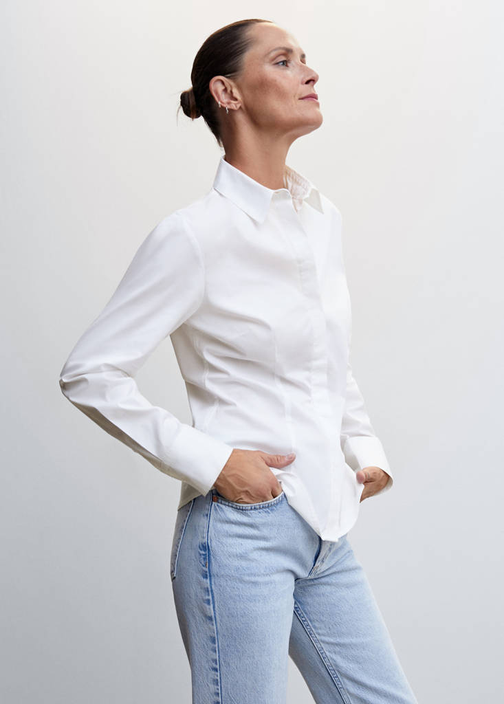 Cotton poplin. Straight design. Suit style. Shirt-style collar. Long sleeve with buttoned cuffs. Dart detail. Button fastening on the front section. Available in plain and patterned. Striped print. Plus Size Available. This garment belongs to our Gift Guide
