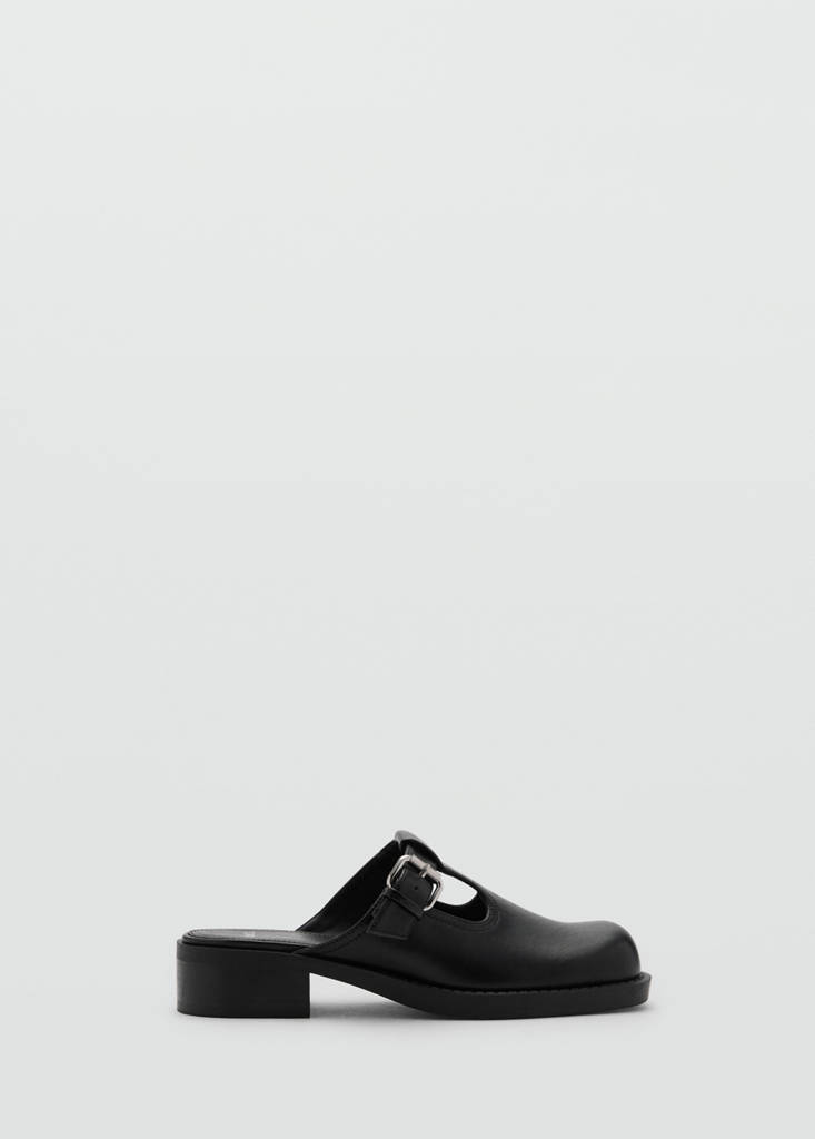 Slingback design. Square toed. Flat. No Fastening. Decorative buckle. Mule style