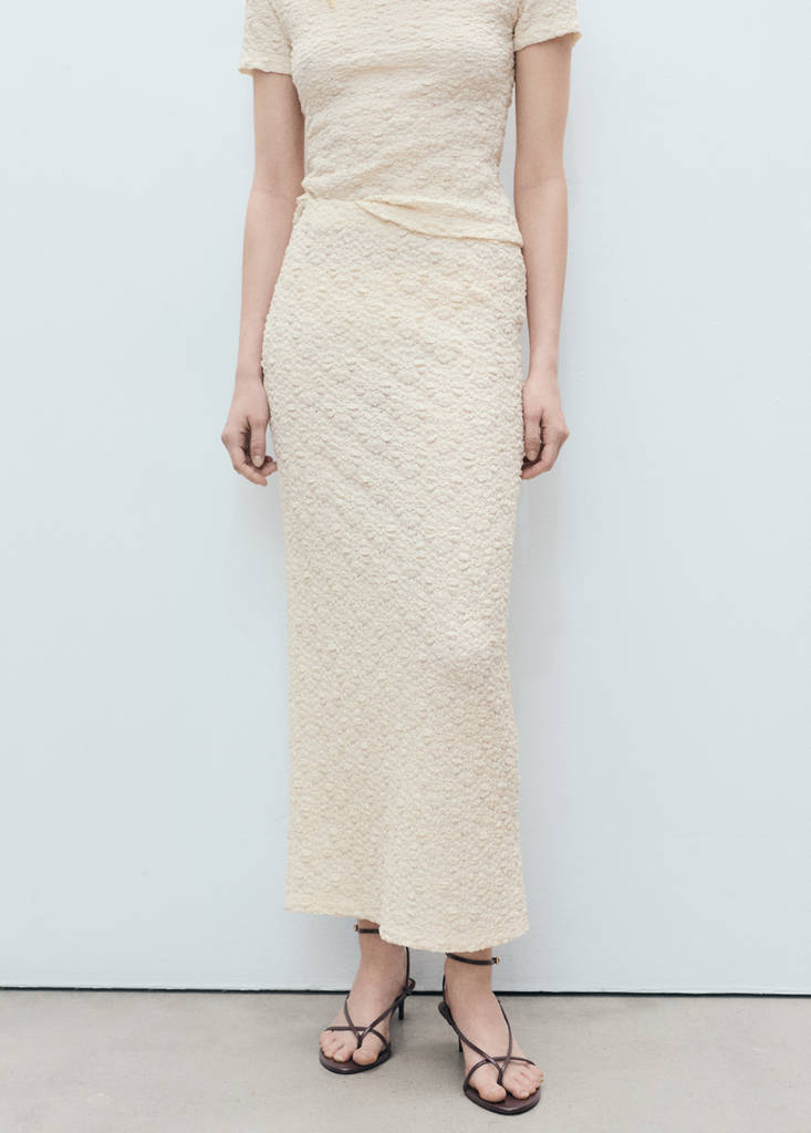 Cotton fabric. Textured fabric. Fitted design. Long design. Elasticated waistband. No Fastening. Total look