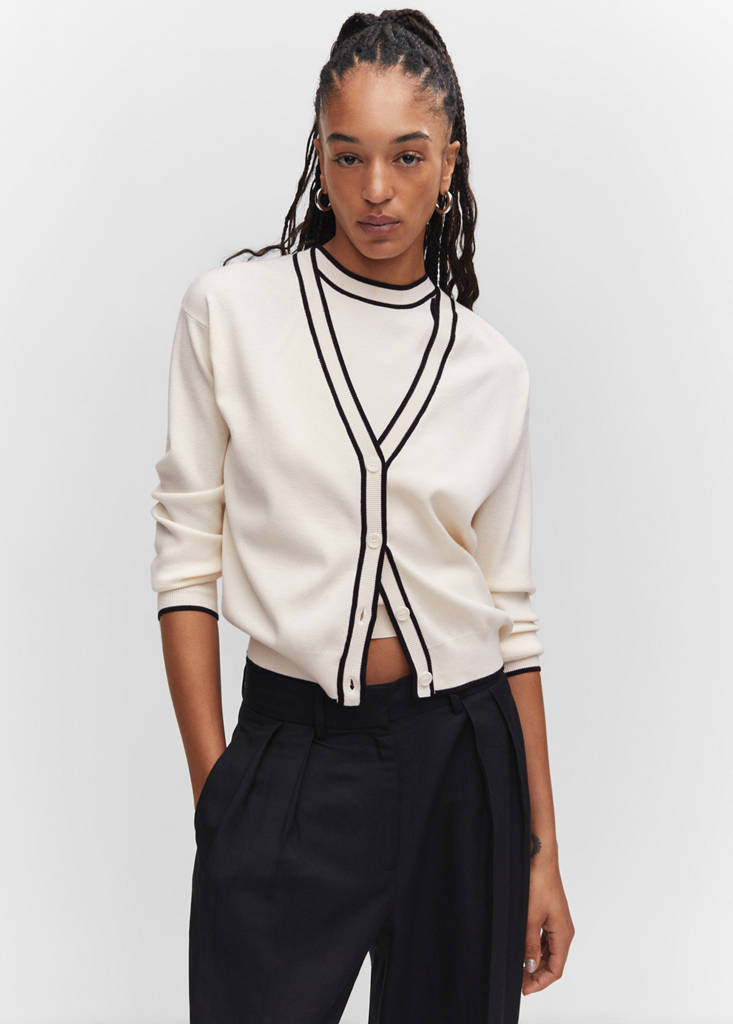 Fine knit fabric. Straight design. V-neck. Long sleeves. Contrasting stripes detail. Button fastening at the front. Total look. Office looks