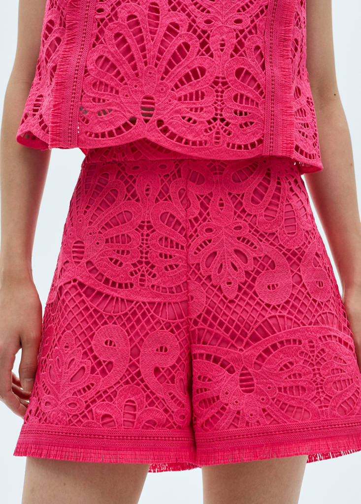 Fine-knit fabric. Crochet design. Short design. Straight design. High waist. Zip fastening on the back section. Frayed finish. Inner lining