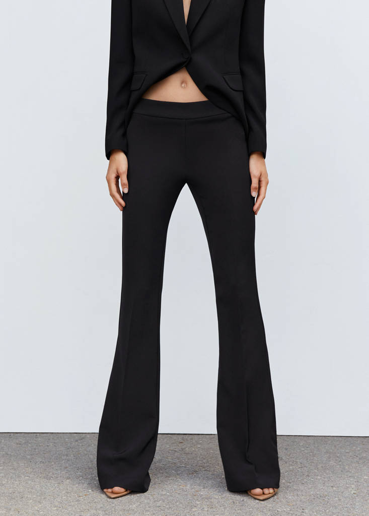 Flared design. Long design. Mid-rise. Side zip fastening. Total look. Office looks