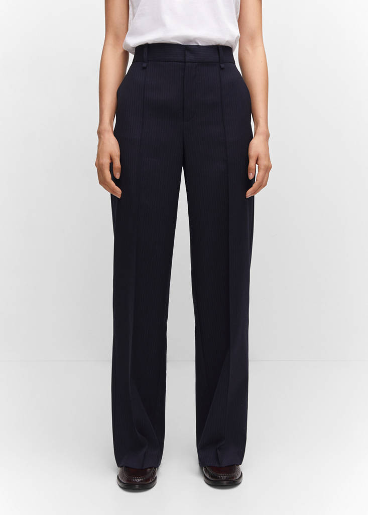 Fluid fabric. Straight design. Long design. Pinstripe pattern. Mid-rise. Two side pockets. Zip and hook fastening. Belt loops. Inner lining. Available Plus. College. Office looks