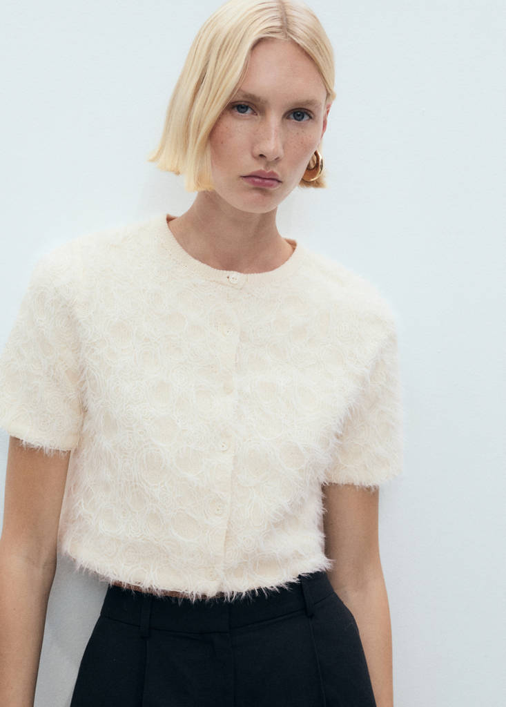 针织短款开襟毛衣当前价格 [¥759.00 ]¥759.00选择颜色米黄色模特穿着160/84A (M)码,身高179cm 。选择尺码160/84A (M)165/88A (L)170/92A (XL)测量添加到愿望清单查看造型免费送货到商店中等针织面料. 组合设计. 直筒设计. 圆领. 短袖. 前扣闭合细节、成分和护理说明门店库存