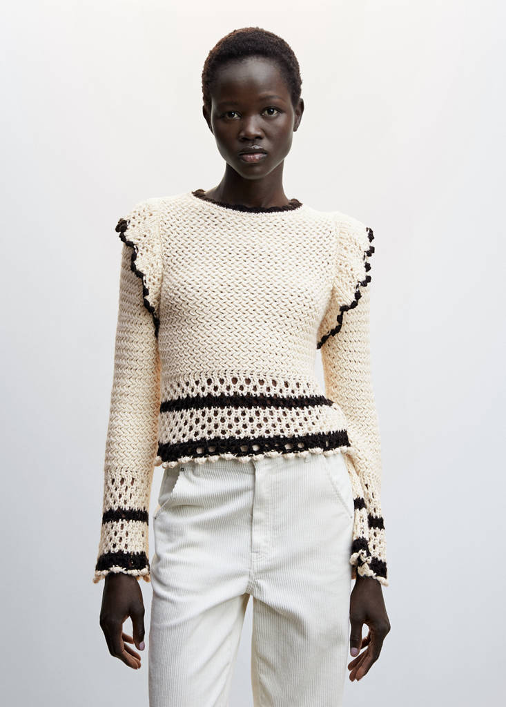荷叶边网眼细节毛衣当前价格 [¥499.00 ]¥499.00选择颜色米色选择尺码155/78A (XS)155/80A (S)160/84A (M)165/88A (L)170/92A (XL)175/96A (XXL)175/100A (3XL)测量添加到愿望清单查看造型免费送货到商店中厚针织. 直筒设计. 短款设计. 圆领. 长袖. 网眼细节. 肩部有荷叶边细节、成分和护理说明门店库存