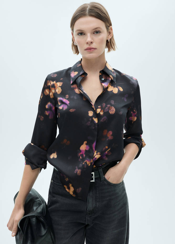 缎面织物. 流畅面料. 直筒设计. 印花设计. 衬衫领. 系扣长袖. 前襟纽扣闭合
