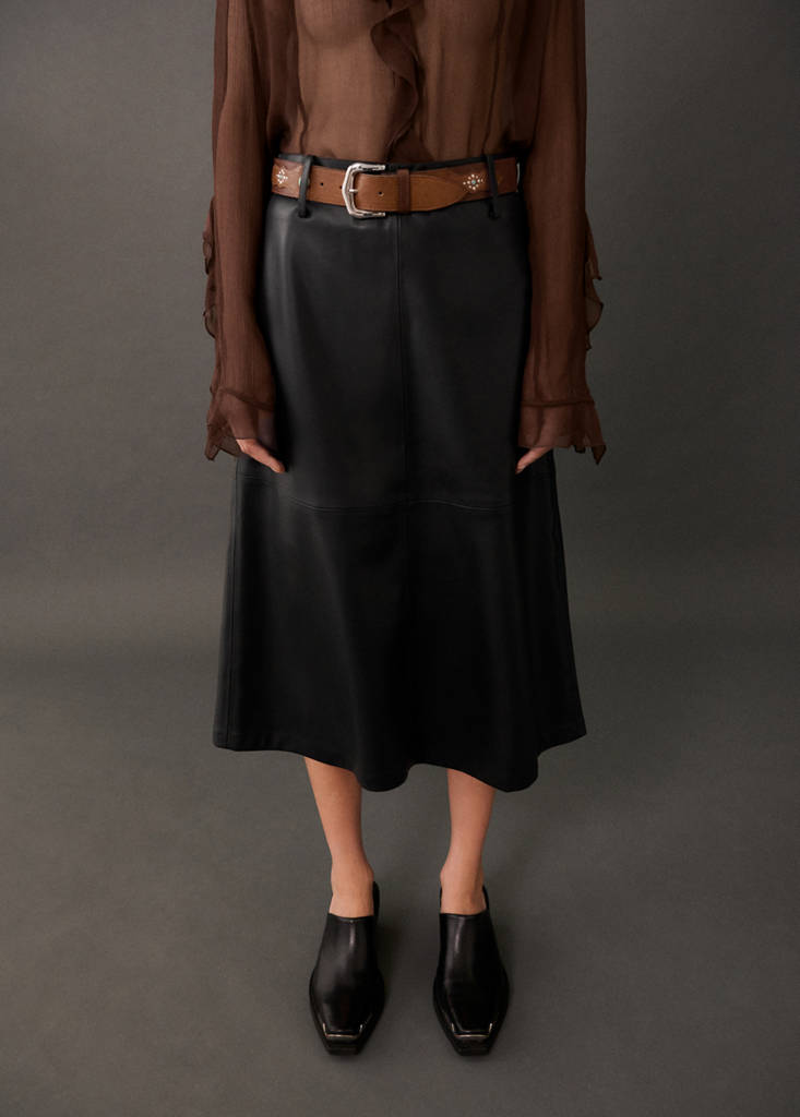 皮革质感中长裙当前价格 [¥499.00 ]¥499.00选择颜色黑色模特穿着160/64A (36)码,身高177cm 。选择尺码155/58A (32)155/62A (34)160/64A (36)165/68A (38)170/72A (40)170/74A (42)175/78A (44)175/82A (46)测量添加到愿望清单查看造型免费送货到商店A字设计. 中长设计. 腰带环. 背后开隐形拉链. 中腰. 皮革效果. 装饰性腰带细节、成分和护理说明门店库存