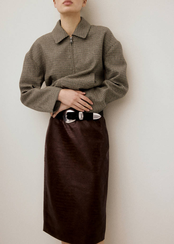 网店专享鳄鱼纹中长裙当前价格 [¥399.00 ]¥399.00选择颜色褐色模特穿着160/64A (36)码,身高178cm 。选择尺码155/62A (34)160/64A (36)165/68A (38)170/72A (40)170/74A (42)尺寸指南添加到愿望清单查看造型免费送货到商店查看商店库存情况描述鳄鱼皮效果. 中长设计. 直筒设计. 中腰. 后摆开衩. 侧面拉链闭合. 整体造型. 在线独家.查看详情分享