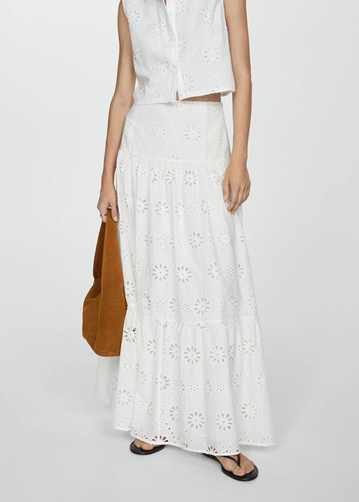 A字设计. 长款设计. 网眼设计. 高腰. 侧面开拉链. 波浪裙摆. 刺绣设计. 100% 纯棉面料