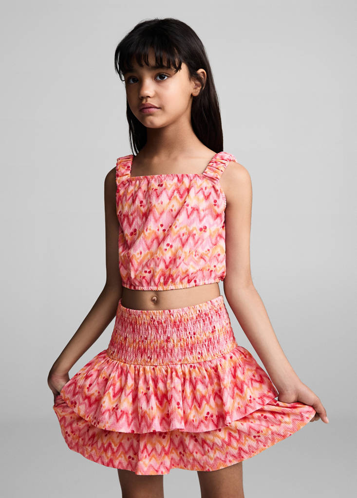 100% 棉. 短款设计. 波西米亚风印花. 褶皱面板. 荷叶边设计. 印花设计