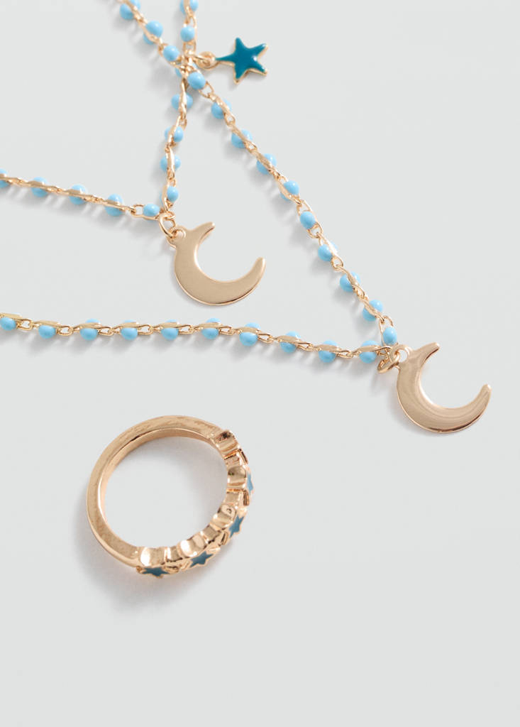 项链、手链和戒指套装当前价格 [¥119.00 ]¥119.00选择颜色金黄色选择尺码均码添加到愿望清单查看造型免费送货到商店三双装. 星星吊坠. 组合串珠. 新月项链. 星星设计. 卡宾细链搭扣细节、成分和护理说明门店库存