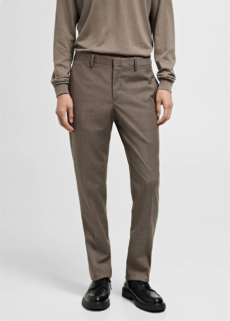 精裁西装系列. 超修身. 人字纹印花. 舒适弹力:弹力面料,更显舒适. 面料由再生聚酯纤维制作,这是一种耐用、透气且易于打理的纤维,使用舒适. 中腰. 系隐形纽扣,系钩针,开拉链. 皮带环. 两个侧袋. 臀部暗藏零钱口袋. 后部两个嵌线口袋,带纽扣. 前后熨烫线条细节. 舒适拉伸:水平和垂直拉伸面料,增加舒适度