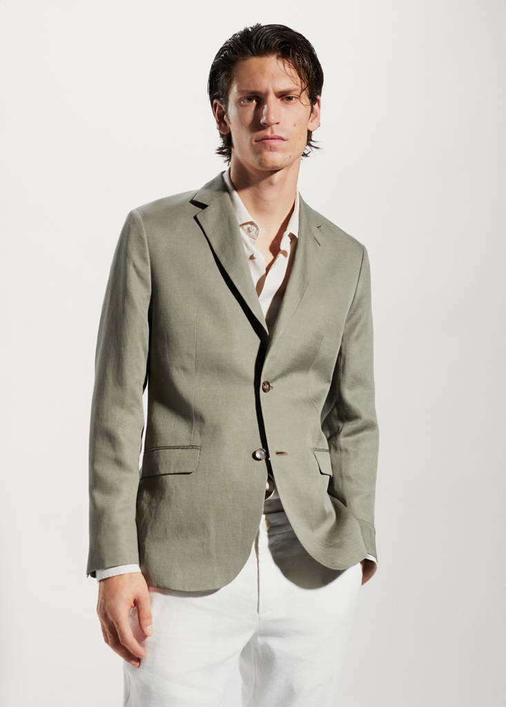 修身版型. 亚麻和莱赛尔混纺面料. 标准设计. 凹形翻领. 单线嵌袋,装饰性袋盖. 长袖带系扣袖口. 背后开叉. 正面内衬. 内衬. 两个内袋. 内袋. 直下摆. 精裁西装系列. 前扣闭合
