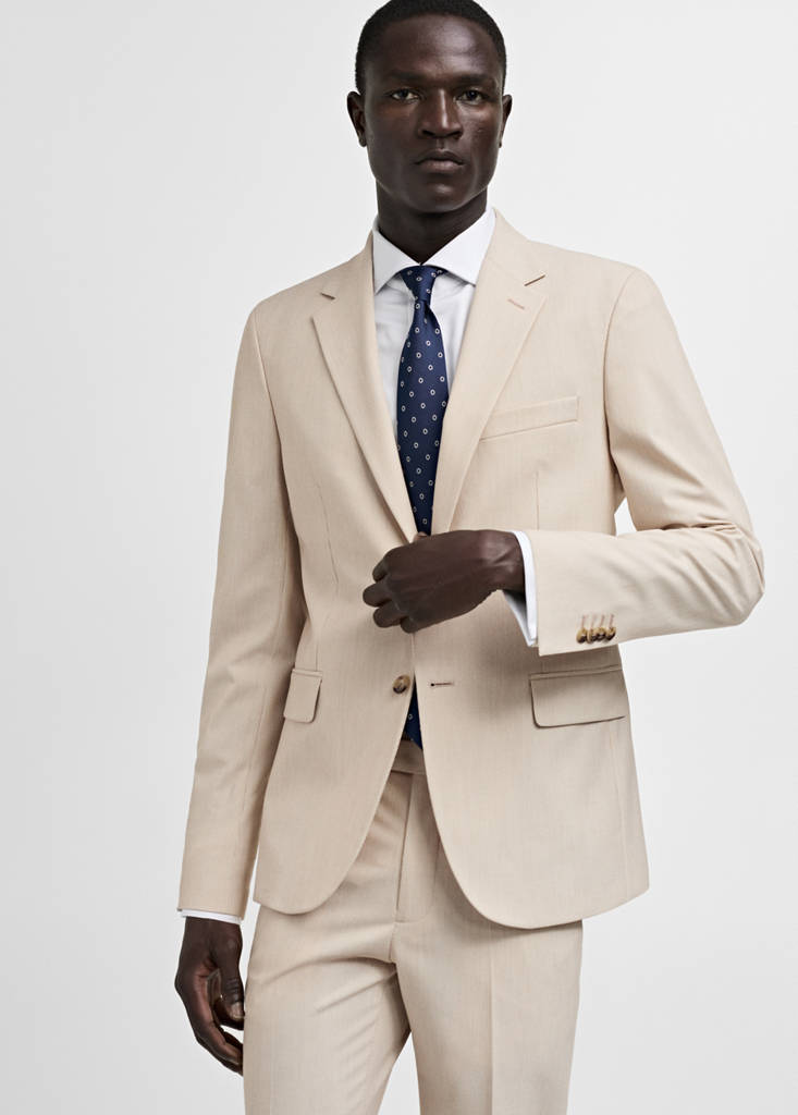 修身版型. 舒适弹力:弹力面料,更显舒适. 凹形翻领和袖窿. 前面双扣闭合. 胸前嵌线口袋. 两个正面翻盖口袋. 背后开两道叉. 内衬. 三个内袋. 精裁西装系列. 舒适拉伸:水平和垂直拉伸面料,增加舒适度. 系扣长袖